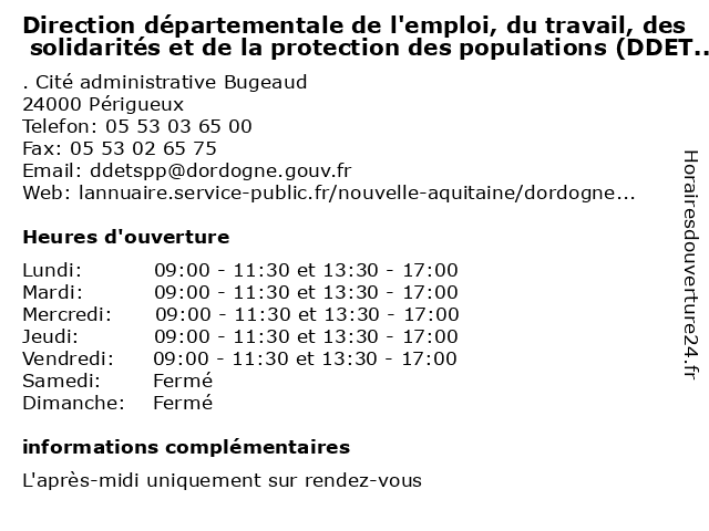 1 Samsic Emploi (Distance: 0,68 km) 14 Rue du Président Wilson, 24000 Périgueux emploi, intérim, recrutement, samsic 2 Pôle Emploi (Distance: 0,69 km) 1 Rue littre, 24000 Périgueux administration, agence, candidats, emploi, employeurs, offres, pole, public, publique, pôle, recherche, service, travail 4 Direction Départementale de la Sécurité Publique (Distance: 0,82 km) . Rue du 4-Septembre, 24016 Périgueux administration, ddsp, de, direction, dordogne, départementale, la, organismes, publics, publique, services, sécurité 5 CFDT - Confédération française démocratique du travail (Distance: 1,01 km) 26 Rue Bodin, 24000 Périgueux cfdt, confédération, du, démocratique, française, travail 6 Direction des services départementaux de l'Éducation nationale (DSDEN) (Distance: 1,56 km) 20 Rue Alfred de Musset, 24000 Perigueux de, departemental, departementaux, des, direction, dordogne, dsden, départementaux, education, l'éducation, nat, nationale, publique, santé, service, services |