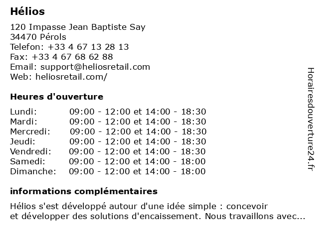 1 Hélios Optique (Distance: 2,23 km) . Route de Carnon, 34470 Pérols cafe, chaussures, enfants, homme, hypermarche, hélios, mode femme, optique, restaurant, service 2 Hélios Optique (Distance: 3,86 km) . Route de Carnon, 34470 Perols beaute, boutiques, brasserie, cache, chaussures, concorde, deco, enfants, hélios, le, mode femme, mode hommes, optique, restaurant, rocher, sport 3 Hélios Solaire (Distance: 3,86 km) . Route de Carnon, 34470 Perols beaute, boutiques, brasserie, cache, chaussures, concorde, deco, enfants, hélios, le, mode femme, mode hommes, restaurant, rocher, solaire, sport 4 Résidence Villa d'Hélios (Distance: 4,69 km) 7 Rue de la Fontaine de Lattes, 34000 Montpellier d'hélios, hébergement, restauration, retraite, résidence, seniors, villa 5 Pharmacie Hélios (Distance: 4,90 km) 9 avenue du Pont Trinquat, 34070 Montpellier hélios, la médecine, la pharmacie, la santé, les soins, pharmacie 6 Proximark - Groupe Hélios (Distance: 9,27 km) 202 Avenue Gustave Courbet, 34750 Villeneuve-lès-Maguelone groupe, hélios, proximark |