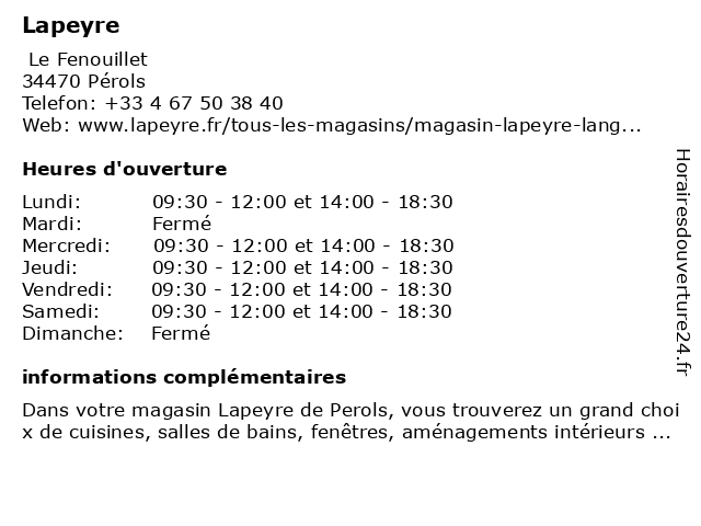 1 Lapeyre "Drive" (Distance: 0,17 km) - Le Fenouillet, 34477 Pérols "drive", chaîne, lapeyre, salles de bains et l'aménagement intérieur et extérieur de la maison, spécialisée dans les cuisines 2 Maître Céline Lapeyre - Avocate (Distance: 6,51 km) 1 boulevard Professeur Louis Vialleton, 34000 Montpellier avocate, avocats, civils, céline, droits, juridiques, lapeyre, maître 4 Lapeyre "Drive" (Distance: 43,47 km) 270 avenue michel debre, 30000 Nimes "drive", chaîne, lapeyre, salles de bains et l'aménagement intérieur et extérieur de la maison, spécialisée dans les cuisines 6 Lapeyre Quincaillerie (Distance: 59,52 km) 12 Rue du Saint-Victor, 34500 Villeneuve-lès-Béziers lapeyre, quincaillerie |