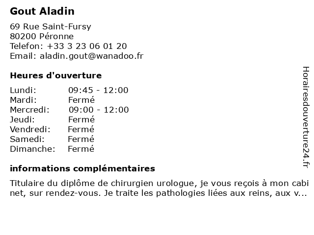 2 Dr Aladin Gout - Chirurgien urologue (Distance: 28,10 km) 1 boulevard du Docteur Schweitzer, 02100 Saint-Quentin aladin, chirurgien, consultation, docteur, dr, gout, med, médecin, médecine, traitement, urologue 6 |