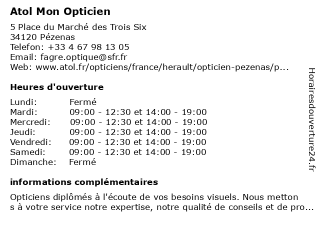 | Mercredi | 09:00-12:30 et 14:00-19:00 |