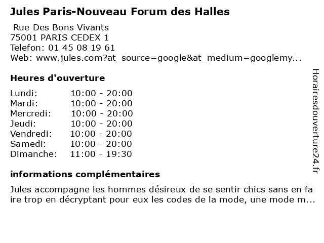 Termes de recherche pour Jules Paris-Nouveau Forum des Halles:paris, des, mode, nouveau, halles, jules, forum, magasin de t-shirts, magasin d’accessoires de mode, magasin de smokings |