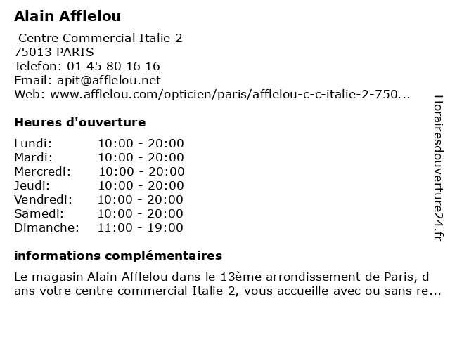 1 Alain Afflelou (Distance: 0,95 km) 121 Avenue d'Italie, 75013 Paris afflelou, alain, glasses, optician, store 2 Alain Afflelou (Distance: 1,97 km) 50 Avenue Du General Leclerc, 75014 Paris accessoires, afflelou, alain, lentilles de contact, lunettes, opticien, optique 3 Alain Afflelou (Distance: 4,77 km) 28 Avenue du General de Gaulle, 93541 Bagnolet accesoires, afflelou, alain, cafe, chausseres, enfants, homme, mode femmes, restaurant 4 Alain Afflelou (Distance: 5,21 km) 235 Rue Etienne Marcel, 93556 Montreuil accessoires, afflelou, alain, cafe, chaussures, hauts, homme, lingerie, mode femme, restaurant 5 Alain Afflelou (Distance: 9,29 km) 101 Avenue du Général de Gaulle, 94012 Créteil afflelou, alain, lentilles, lunettes, opticien, optique 6 Alain Afflelou (Distance: 10,54 km) 67 Boulevard de la République, 92210 Saint Cloud afflelou, aide auditive, alain, appareil auditif, opticien, prothèses auditive |
