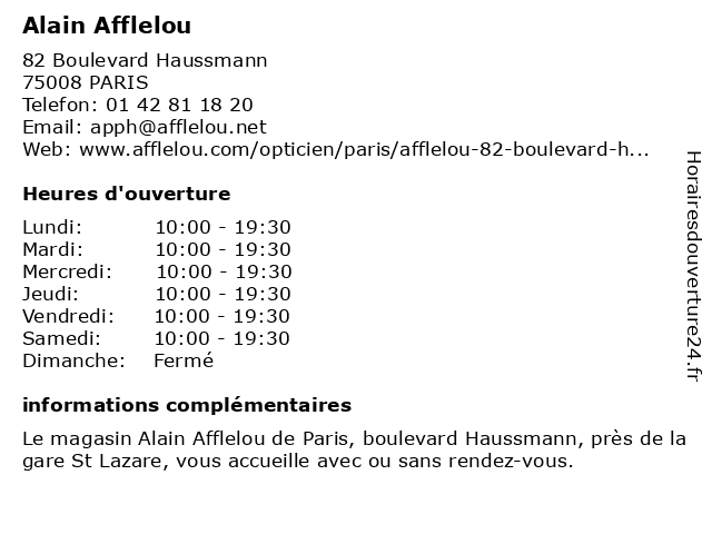 1 Alain Afflelou (Distance: 1,71 km) 104 Avenue Des Champs Elysées, 75008 PARIS afflelou, alain, cabinet d'ophtalmologie, magasin de lunettes de soleil, ophtalmologie, optométrie 2 Alain Afflelou (Distance: 2,11 km) Centre Commercial Forum Des Halles, 75001 PARIS afflelou, alain, magasin de lunettes de soleil, magasin d’accessoires de mode, optométrie 3 Alain Afflelou (Distance: 4,03 km) 72 bis avenue de Flandres, 75019 Paris afflelou, aide auditive, alain, appareil auditif, opticien, prothèses auditive 4 Alain Afflelou (Distance: 4,87 km) 50 Avenue Du General Leclerc, 75014 Paris accessoires, afflelou, alain, lentilles de contact, lunettes, opticien, optique 5 Alain Afflelou (Distance: 6,34 km) 121 Avenue d'Italie, 75013 Paris afflelou, alain, glasses, optician, store 6 Alain Afflelou (Distance: 6,67 km) 26 Avenue du Général de Gaulle, 93170 Bagnolet afflelou, alain, lentilles, lunettes, montures, opticien, optique |