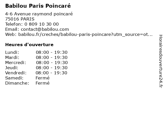 1 Babilou (Distance: 0,01 km) 6 Avenue Raymond Poincaré, 75016 Paris babilou, babysitting, crèches, garde d'enfants 2 Le PoinCaré (Distance: 0,10 km) 22 Avenue Raymond Poincare, 75116 Paris bar, bistro, bistrot, brasserie, café, le, poincaré, restaurant, restauration 3 Cojean Poincaré (Distance: 0,13 km) 28 Avenue Raymond Poincaré, 75116 Paris café, cojean, poincaré, traiteur 4 Parking Zenpark (Trocadéro - Raymond Poincaré) (Distance: 0,24 km) 29 bis rue Saint-Didier, 75116 Paris parking, poincaré, raymond, stationnement, trocadéro, zenpark 5 Cafétéria Poincaré (Henri) (Distance: 4,72 km) 11 rue Pierre et Marie Curie, 75005 Paris cafétéria, campus, henri, poincaré, restaurant, universitaire 6 Babilou Asnieres De Gaulle (Distance: 4,88 km) 53 Grande rue charles de gaulle, 92600 ASNIÈRES SUR SEINE asnieres, babilou, de, gaulle |