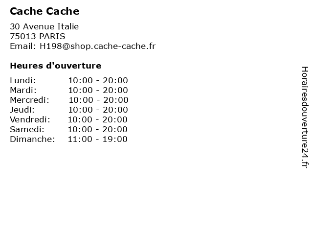 1 Cache Cache (Distance: 2,93 km) 30 Boulevard Paul Vaillant, 94200 Ivry Sur Seine cache, homme, mode femme 3 Cache Cache (Distance: 8,01 km) . Rue de la Loge, 94260 Fresnes cache, cafe, chaussures, enfants, homme, lingerie, mode femme, restaurant 4 Cache cache (Distance: 8,78 km) 23 Rue Madeleine Vionnet, 93300 Aubervilliers alimentation, beauté & sante, cache, culture & loisirs, enfants, high-tech, maison & déco, mode, restaurants 5 Cache cache (Distance: 8,82 km) 101 Avenue du Général de Gaulle, 94012 Creteil alimentation, beauté & santé, cache, culture & loisirs, enfants, high-tech, maison & déco, mode, restaurants 6 |
