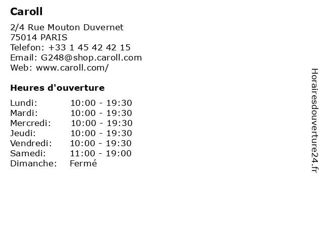 3 Caroll (Distance: 2,32 km) 30 Centre Commercial Régional Italie, 75013 PARIS blazer femme, cardignan femme, caroll, chaussures femme, gilet femme, jean femme, magasin femme, magasin vêtements, manteau femme, mode femme, pull femme, robe femme, sac femme, t-shirt femme, tailleur femme, top femme, vêtements femmes 5 Caroll (Distance: 4,65 km) 64 Boulevard Haussmann,, 75009 Paris caroll, décontracté, fantaisie, mode, tendance 6 |