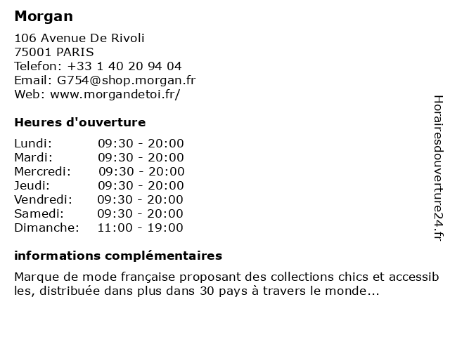 1 Morgan (Distance: 0,32 km) 61-63 Rue de la Boucle, 75001 Paris accessoires, femme, magasin, mode, morgan, prêt à porter 2 Morgan (Distance: 0,43 km) 101 Porte Berger, 75045 Paris chaussures, lingerie, mode enfant, mode femmes, mode hemmes, morgan, sport 3 Morgan (Distance: 1,86 km) 40 Boulevard Haussmann, 75009 Paris accessoires, chaussures, jeans, maroquinerie, morgan, sandales 4 Morgan (Distance: 1,96 km) 37 rue de la Chaussée d'Antin, 75009 Paris accessoires, chaussures, jeans, maroquinerie, morgan, sandales 5 Morgan (Distance: 2,26 km) 4 rue du 8 mai 1945, 75010 Paris accessoires, chaussures, jeans, maroquinerie, morgan, sandales 6 Morgan (Distance: 2,35 km) 22 rue du départ, 75015 Paris accessoires, chaussures, jeans, maroquinerie, morgan, sandales |