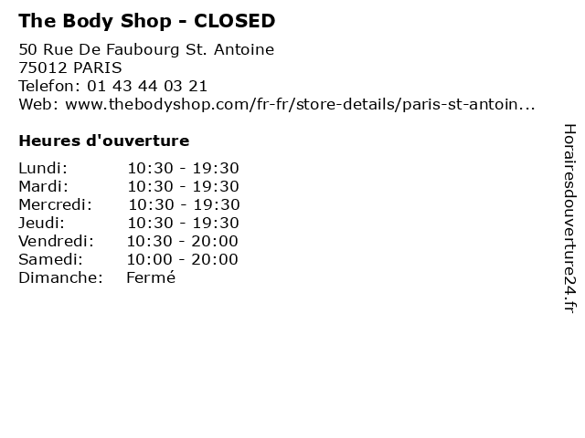 1 The Body Shop - CLOSED (Distance: 2,16 km) 12 Boulevard St, 75006 PARIS body, boutique de cadeaux, closed, shop, the 2 The Body Shop - CLOSED (Distance: 2,86 km) 30 Avenue D'italie, 75013 PARIS body, boutique de cadeaux, closed, shop, the 3 The Body Shop - CLOSED (Distance: 2,95 km) Gare De L'est, 75010 PARIS body, boutique de cadeaux, closed, shop, the 4 The Body Shop - CLOSED (Distance: 3,64 km) 112 Rue de maubeuge, 75010 Paris body, boutique de cadeaux, closed, shop, the 5 The Body Shop - CLOSED (Distance: 4,02 km) 49 Rue de lévis, 75017 Paris body, boutique de cadeaux, closed, shop, the 6 The Body Shop - CLOSED (Distance: 4,02 km) 96 Rue De Provence, 75009 PARIS body, boutique de cadeaux, closed, shop, the |