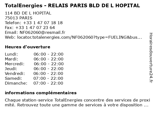 Termes de recherche pour TotalEnergies - RELAIS PARIS BLD DE L HOPITAL:relais, de, paris, hopital, total, bld, gas station, station service, tankstelle, totalenergies |