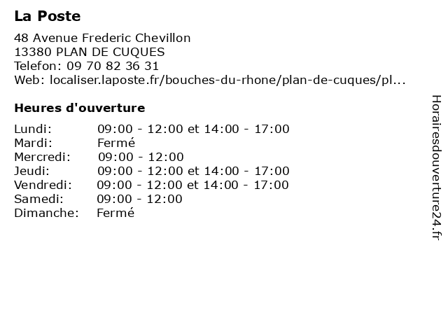 1 La Poste (Distance: 6,39 km) 3 Montée d'Eoures, 13011 Marseille agence, assurance, banque, banque postale, bureau de poste, chronopost, colis, courrier, dps, expéditions internationales, la, point, postale, poste, relais, timbres, téléphonie, ups, western union 5 La Poste (Distance: 8,60 km) - Place de la Mairie, 13950 Cadolive agence, assurance, banque, banque postale, bureau de poste, chronopost, colis, courrier, dps, expéditions internationales, la, point, postale, poste, relais, timbres, téléphonie, ups, western union 6 La Poste (Distance: 8,71 km) - Chemin de l'Adrech, 13119 Saint-Savournin agence, assurance, banque, banque postale, bureau de poste, chronopost, colis, courrier, dps, expéditions internationales, la, point, postale, poste, relais, timbres, téléphonie, ups, western union |