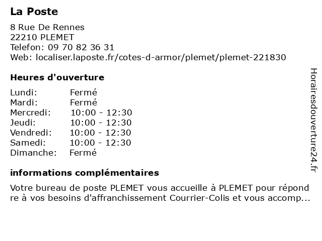 1 La Poste (Distance: 8,14 km) 33 Rue de l'Argoat, 22210 Plumieux agence, assurance, banque, banque postale, bureau de poste, chronopost, colis, courrier, dps, expéditions internationales, la, point, postale, poste, relais, timbres, téléphonie, ups, western union 2 La Poste (Distance: 9,30 km) 4 Rue du Moulin, 56490 La Trinité-Porhoët agence, assurance, banque, banque postale, bureau de poste, chronopost, colis, courrier, dps, expéditions internationales, la, point, postale, poste, relais, timbres, téléphonie, ups, western union 4 La Poste (Distance: 12,49 km) 6 Rue du Cap de Vaisseau Mando, 22150 Langast agence, assurance, banque, banque postale, bureau de poste, chronopost, colis, courrier, dps, expéditions internationales, la, point, postale, poste, relais, timbres, téléphonie, ups, western union 6 La Poste (Distance: 14,61 km) 8 Rue de la Mairie, 56490 Mohon agence, assurance, banque, banque postale, bureau de poste, chronopost, colis, courrier, dps, expéditions internationales, la, point, postale, poste, relais, timbres, téléphonie, ups, western union |