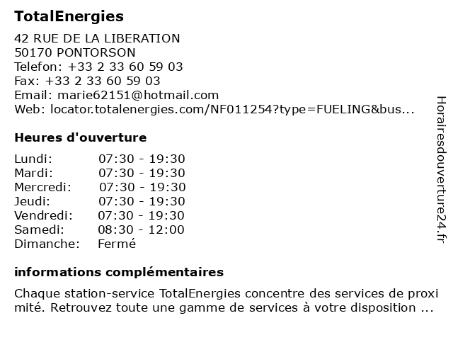 1 TotalEnergies (Distance: 3,83 km) TANIS - RN 175 - LIEU-DIT BREE, 50170 PONTORSON gas station, station service, tankstelle, total, totalenergies 2 TotalEnergies - REL.LE MONT SAINT MICHEL (Distance: 13,27 km) A84 - AIRE DU MONT ST MICHEL, 50240 ST AUBIN DE TERREGATTE michel, mont, rel.le, saint, station autoroute, totalenergies 3 TotalEnergies Station de recharge (Distance: 13,32 km) A84, 50240 Saint-Aubin-de-Terregatte borne de recharge, borne de recharge autoroute, borne de recharge rapide, ccs, chademo, charge haute puissance, charge+, charging station, de, ev, high power charge, ma charge rapide, mobility, recharge, recharger ma voiture, recharger voiture, station, station autouroute, station de recharge, station-service, supercharger, tankstelle, total, totalaccess, totalenergie, totalenergies 4 TotalEnergies - AVRANCHES MANCHE AUTO (Distance: 17,14 km) Boulevard du Luxembourg, 50300 Le Val-Saint-Père auto, avranches, gas station, manche, station service, tankstelle, total, totalenergies 5 TotalEnergies - SARL JLJ DISTRIBUTION (Distance: 19,25 km) Route du Mont Saint-Michel, 35490 Romazy distribution, gas station, jlj, sarl, station service, tankstelle, total, totalenergies 6 Station-Service TotalEnergies (Distance: 20,51 km) 4 Rue du Général de Gaulle, 35120 Baguer Morvan carburant, essence, pompes, service, station, totalenergies, véhicules |