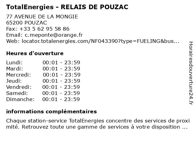 Termes de recherche pour TotalEnergies - RELAIS DE POUZAC:relais, de, pouzac, total, gas station, station service, tankstelle, totalenergies |
