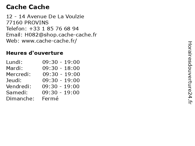 4 Vib's (Cache Cache - Bonobo - Bréal) (Distance: 41,53 km) 117 Champbertrand, 89100 SENS bonobo, bréal, cache, vib's 5 Cache-Cache (Distance: 49,28 km) 306 Route Departementale, 77240 Cesson cache, cafe, chaussures, enfants, lingerie, mode femme, mode homme, restaurant 6 |