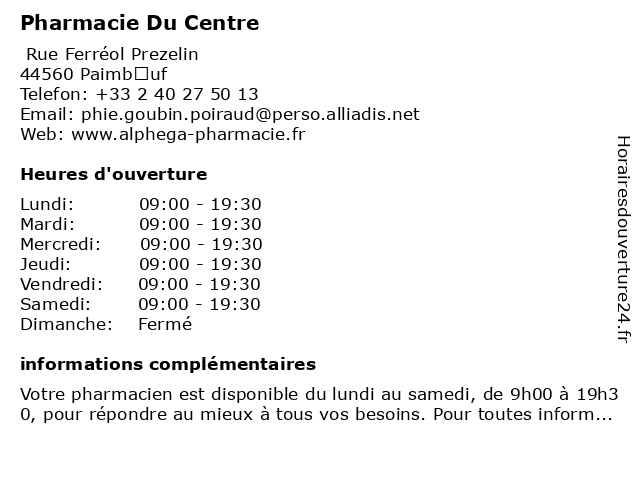 1 Pharmacie du Marché (Distance: 1,19 km) 1 place du Marché, 44560 Paimboeuf du, homéopathie, marché, médicaments, orthopédie, parapharmacie, pharmacie 2 Pharmacie Bonnafy (Distance: 3,44 km) 2 Place Berty Bouyer, 44560 Corsept bonnafy, homéopathie, médicaments, orthopédie, parapharmacie, pharmacie 3 Pharmacie Osselin (Distance: 5,73 km) 42 Avenue de la Paix, 44480 Donges homéopathie, médicaments, orthopédie, osselin, parapharmacie, pharmacie 4 Pharmacie Du Prieure (Distance: 9,27 km) Rue du Prieuré, 44320 Saint-Père-en-Retz du, pharmacie, prieure 5 Pharmacie Schmitzberger (Distance: 11,60 km) 113 Avenue de Mindin, 44250 Saint-Brévin-les-Pins herboristerie, médicaments, paramédical, parapharmacie, pharmacie, pharmacien, santé, schmitzberger, traitements 6 Pharmacie des Dunes (Distance: 11,94 km) 9 Rue du Général de Gaulle, 44250 Saint-Brévin-les-Pins des, dunes, herboristerie, médicaments, paramédical, parapharmacie, pharmacie, pharmacien, santé, traitements |
