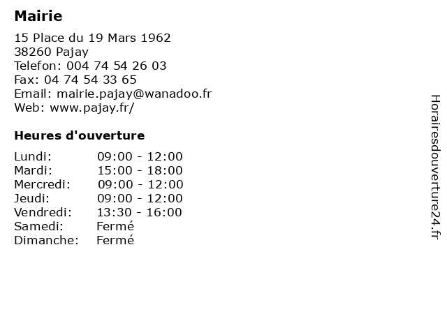 1 Mairie de Pajay (Distance: 4,25 km) 15 Place du 19-Mars-1962, 38260 Pajay administration, assoc public, de, mairie, pajay 2 Mairie d'Arzay (Distance: 4,28 km) . Place de la Mairie, 38260 Arzay administration, assoc public, d'arzay, mairie 3 Mairie de Saint-Barthélemy (Distance: 5,04 km) 213 Route de Beaurepaire, 38270 Saint-Barthélemy administration, assoc public, barthélemy, de, mairie, saint 4 Mairie de Pisieu (Distance: 5,29 km) 6 Place de la Mairie, 38270 Pisieu administration, assoc public, de, mairie, pisieu 5 Mairie de Sardieu (Distance: 5,65 km) 131 Chemin Neuf, 38260 Sardieu administration, de, mairie, publique, sardieu, service 6 Mairie de Pact (Distance: 11,84 km) 274 Grande rue, 38270 Pact administration, assoc public, de, mairie, pact |