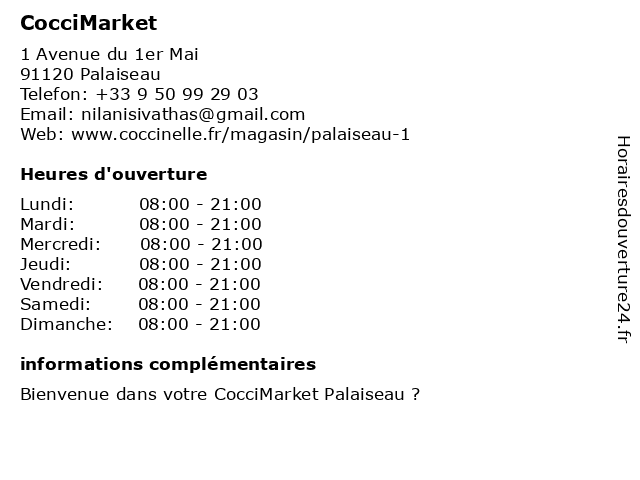 1 CocciMarket (Distance: 1,32 km) 40 Avenue du 8 Mai 1945, 91120 Palaiseau alimentation, coccimarket, magasin, superette, supermarché, épicerie 2 CocciMarket (Distance: 2,09 km) 29 Rue de la Division Leclerc, 91300 Massy alimentation, boisson, coccimarket, fruits, légumes, superette, épicerie 3 CocciMarket (Distance: 9,69 km) 16 Rue De La Mairie, 92220 Bagneux aliments, coccimarket, consommation, marchandises, marché, shop, shopping, supermarche 4 Coccimarket (Distance: 10,16 km) 49 Rue Edouard Vaillant, 91200 Athis-Mons coccimarket, liquor, market, supermarket 5 CocciMarket (Distance: 12,27 km) 58-62 boulevard de Stalingrad, 94600 Choisy-le-Roi alimentation, coccimarket, epiceries, supérette 6 CocciMarket (Distance: 13,75 km) 84 Avenue Victor Hugo, 92100 Boulogne-Billancourt alimentation, coccimarket, magasin, superette, supermarché, épicerie |