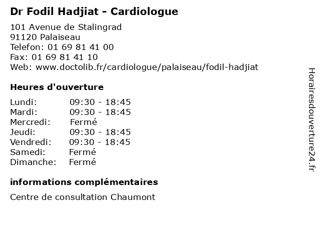 1 Dr. Delphine Esbelin - Cardiologue (Distance: 0,02 km) 101 Avenue de Stalingrad, 91120 Palaiseau cardiologie, cardiologue, consultation, delphine, docteur, dr., esbelin, santé 2 Medecin Leslie Deal (Cardiologue) (Distance: 1,76 km) 6 Rue Winston Churchill, 91300 Massy cardiologue, deal, docteur, leslie, medecin, sante, services 3 Dr Elodie Fauveau - Cardiologue - secretariat (Distance: 1,78 km) 6 Rue Winston Churchill, 91300 Massy cardiologue, dr, elodie, fauveau, médecin, médecine, médical, pharmaceutique, secretariat, sectretariat, traitement 4 Dr Aude Brucker - Cardiologue - secretariat (Distance: 1,78 km) 6 Rue Winston Churchill, 91300 Massy aude, brucker, cardiologue, dr, médecin, médecine, médical, pharmaceutique, secretariat, sectretariat, traitement 5 Dr Fabrizio Pirozzi - Cardiologue (Distance: 8,56 km) 5 Rue des Carnets, 92140 Clamart cardio, cardiologie, cardiologue, coeur, dr, fabrizio, piirozzi, pirozzi 6 Dr Samia Riguet - Cardiologue (Distance: 8,56 km) 5 Rue des Carnets, 92140 Clamart 92140, cardiologue, clamart, dr, riguet, samia |