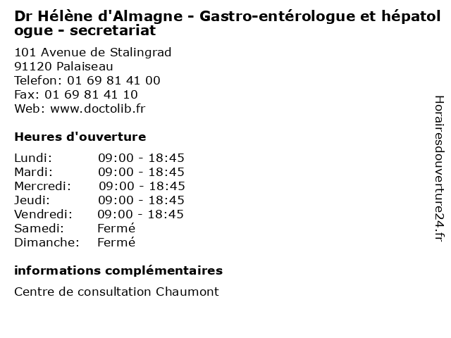 1 Dr Philippe Laurent - Gastro-entérologue et hépatologue -secretariat (Distance: 0,00 km) 101 Avenue de Stalingrad, 91120 Palaiseau dr, entérologue, et, gastro, hépatologue, laurent, médecin, médecine, médical, pharmaceutique, philippe, secretariat, traitement 2 Dr Philippe Laurent - Gastro-entérologue et hépatologue - secretariat (Distance: 0,00 km) 101 Avenue de Stalingrad, 91120 Palaiseau dr, entérologue, et, gastro, hépatologue, laurent, médecin, médecine, médical, pharmaceutique, philippe, secretariat, traitement 3 Medecin Jean Pierre Alle (hépatologue) (Distance: 1,27 km) 2 Maurice Berteaux, 91120 Palaiseau alle, docteur, hépatologue, jean, medecin, pierre, sante, services 4 Medecin Pierre Emile Julien (hépatologue) (Distance: 13,20 km) 43 Avenue du Général Leclerc, 92100 Boulogne-Billancourt docteur, emile, hépatologue, julien, medecin, pierre, sante, services 5 Medecin Vincent Giroud (hépatologue) (Distance: 13,87 km) 20 Avenue de l'Europe, 78000 Versailles docteur, giroud, hépatologue, medecin, sante, services, vincent 6 Medecin Catherine Nizou (hépatologue) (Distance: 14,11 km) 31 Rue des Princes, 92100 Boulogne-Billancourt catherine, docteur, hépatologue, medecin, nizou, sante, services |