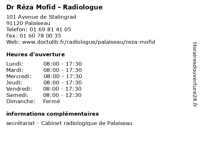 1 Dr Réza Mofid - Radiologue (Distance: 0,00 km) 101 Avenue de Stalingrad, 91120 Palaiseau consultation, docteur, dr, med, mofid, médecin, médecine, radiologue, réza, secrétariat, traitement 2 Dr Réza Mofid - Radiologue (Distance: 8,63 km) 38 Avenue Jules Vallès, 91200 Athis-Mons dr, mofid, médecins, médicaments, radiologue, réza, santé, secrétariat, spécialiste 3 Dr Réza Mofid - Radiologue (Distance: 12,30 km) 12 Rue du Clos, 91130 Ris-Orangis dr, mofid, médecins, médicaments, radiologue, réza, santé, secrétariat, spécialiste 4 Dr Réza Mofid - Radiologue (Distance: 14,69 km) 5 Rue de la Clairière, 91000 Évry dr, mofid, médecins, médicaments, radiologue, réza, santé, secrétariat, spécialiste 5 Dr Réza Mofid - Radiologue (Distance: 15,03 km) - Boulevard des Champs Elysées, 91024 Evry consultation, docteur, dr, med, mofid, médecin, médecine, radiologue, réza, traitement 6 Dr Reza Mofid - Radiologue (Distance: 9,53 km) 30-32 rue Monttessuy, 91260 Juvisy-sur-Orge consultation, docteur, dr, med, mofid, médecin, médecine, radiologue, reza, traitement |