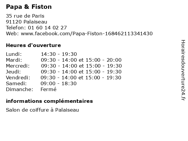 2 Chez Papa (Distance: 11,13 km) 99 avenue Aristide Briand, 94110 Arcueil alimentation, boissons, chez, papa, restaurant 3 Chez Papa Indien (Distance: 12,16 km) 90 Avenue Henri Ginoux, 92120 Montrouge chez, indien, papa, restaurants 4 Dr Papa Dia - Médecin généraliste (Distance: 13,34 km) 10 Rue du Clos, 91130 Ris-Orangis consultation, dia, docteur, dr, généraliste, med, médecin, médecine, papa, secrétariat, traitement 5 Papa Lunettes (Distance: 13,93 km) 72 rue Michel Ange, 75016 Paris lentilles, lunettes, opticien, optique, papa 6 Chez Papa (Distance: 15,06 km) 138 Boulevard montparnasse, 75014 Paris brasserie, chez, cuisine, papa, restaurant, restauration, sud-ouest |