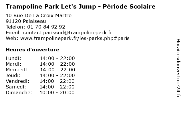 1 Trampoline Park Let's Jump - Congés Scolaires Hors été (Distance: 0,00 km) 10 Rue De La Croix Martre, 91120 Palaiseau balles aux prisonniers, congés, hors, jump, let's, loisirs intérieur, ninja warrior, park, piscine de cubes en mousse, scolaires, trampoline, été 2 Trampoline Park Let's Jump - Congés d'été (Distance: 0,00 km) 10 Rue De La Croix Martre, 91120 Palaiseau balles aux prisonniers, congés, d'été, jump, let's, loisirs intérieur, ninja warrior, park, piscine de cubes en mousse, trampoline 3 Bibliothèque municipale Boris Vian - Période scolaire (Distance: 3,94 km) 156 rue du Président François Mitterrand, 91160 Longjumeau bibliothèque, boris, cd audio, cd.rom, livres, municipale, période, revues, scolaire, vian 4 Piscine intercommunale (periode scolaire) (Distance: 5,36 km) 2 avenue du Parc des Sports, 94260 Fresnes formation, fresnes, intercommunale, periode, piscine, scolaire 5 Beach Bowling (Période Scolaire) (Distance: 9,28 km) - Avenue de Luxembourg, 94320 Thiais beach, bowling, loisirs, période, scolaire, sortie 6 Piscine Suzanne Berlioux (période scolaire) (Distance: 9,36 km) 17 rue Jules Ferry, 91260 Juvisy-sur-Orge /horaires, berlioux, et, fermeture, formation, lundi, mardi, piscine, période, scolaire, suzanne, vendredi |