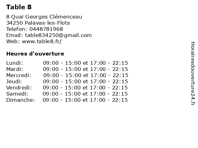 | Lundi | 09:00-15:00 et 17:00-22:15 |