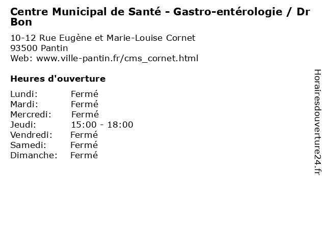 1 Centre Municipal de Santé - Médecine générale (Distance: 0,00 km) 10-12 Rue Eugène et Marie-Louise Cornet, 93500 Pantin bureau, centre, consultation, de, dr, générale, maladie, med, municipal, médecin, médecine, pratique, santé, thérapie, traitement 2 Centre Municipal de Santé - Alcoologie (Distance: 0,00 km) 10-12 Rue Eugène et Marie-Louise Cornet, 93500 Pantin alcoologie, bureau, centre, consultation, de, dr, maladie, med, municipal, médecin, médecine, pratique, santé, thérapie, traitement 3 Centre Municipal de Santé - Anti-tabac (Distance: 0,00 km) 10-12 Rue Eugène et Marie-Louise Cornet, 93500 Pantin anti, bureau, centre, consultation, de, dr, maladie, med, municipal, médecin, médecine, pratique, santé, tabac, thérapie, traitement 4 Centre Municipal de Santé - Allergologie et explorations fonctionneles respiratoires (Distance: 0,00 km) 10-12 Rue Eugène et Marie-Louise Cornet, 93500 Pantin allergologie, bureau, centre, consultation, de, dr, et, explorations, fonctionneles, maladie, med, municipal, médecin, médecine, pratique, respiratoires, santé, thérapie, traitement 5 Centre Municipal de Santé - Cardiologie - holters rythmiques, holters tensionnels et ECG (Distance: 0,00 km) 10-12 Rue Eugène et Marie-Louise Cornet, 93500 Pantin bureau, cardiologie, centre, consultation, de, dr, ecg, et, holters, maladie, med, municipal, médecin, médecine, pratique, rythmiques, santé, tensionnels, thérapie, traitement 6 Centre Municipal de Santé - Dermatologie / Dr Bénédicte Chaine (Distance: 0,00 km) 10-12 Rue Eugène et Marie-Louise Cornet, 93500 Pantin bureau, bénédicte, centre, chaine, consultation, de, dermatologie, dr, maladie, med, municipal, médecin, médecine, pratique, santé, thérapie, traitement |