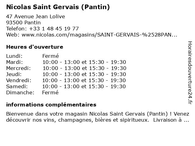 1 Nicolas (Distance: 0,00 km) 47 Avenue J. Lolive, 93500 Pantin champagnes, hyper-supermarchés, nectars, nicolas, vente au détail de vin, vin 2 Nicolas (Distance: 0,76 km) 72 Rue André Joineau, 93310 Le Pre Saint Gervais champagnes, hyper-supermarchés, nectars, nicolas, vente au détail de vin, vin 3 Nicolas Juste - Masseur-kinésithérapeute (Distance: 2,06 km) 11 Passage de Flandre, 75019 Paris de, docteur, generaliste, juste, kinésithérapeute, maison, masseur, medical, nicolas, quai, santé, seine, soin 5 Nicolas (Distance: 3,66 km) 120 Boulevard Richard Lenoir, 75011 Paris hyper-supermarchés, nicolas, vente au détail de vin, vin 6 Nicolas (Distance: 3,77 km) 1 Rue du Château d'Eau, 75010 Paris champagnes, hyper-supermarchés, nectars, nicolas, vente au détail de vin, vin |