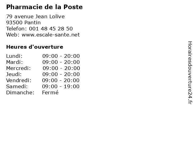 1 Pharmacie de la Poste (Distance: 0,78 km) 13-13 avenue Jean Jaures, 93310 Le Pre Saint Gervais de, la, la médecine, la pharmacie, la santé, les soins, pharmacie, poste 2 Pharmacie de la Poste (Distance: 5,37 km) 44 rue Montmartre, 75002 Paris de, herboristerie, la, médicaments, paramédical, parapharmacie, pharmacie, pharmacien, poste, santé, traitements 3 Pharmacie de la Poste (Distance: 9,50 km) 60 rue de la Croix Nivert, 75015 Paris de, la, médicaments, pharmacie, poste, santé, service 4 Pharmacie de la Poste (Distance: 10,98 km) 81 Rue Jean Jaures, 95400 Arnouville de, herboristerie, la, médicaments, paramédical, parapharmacie, pharmacie, pharmacien, poste, santé, traitements 5 Pharmacie de la Poste (Distance: 10,98 km) 81 Rue Jean Jaures, 95400 Arnouville de, herboristerie, la, médicaments, paramédical, parapharmacie, pharmacie, pharmacien, poste, santé, traitements 6 Pharmacie de la Poste (Distance: 11,27 km) 29, rue du General de Gaulle, 93370 Montfermeil de, la, la médecine, la pharmacie, la santé, les soins, pharmacie, poste |