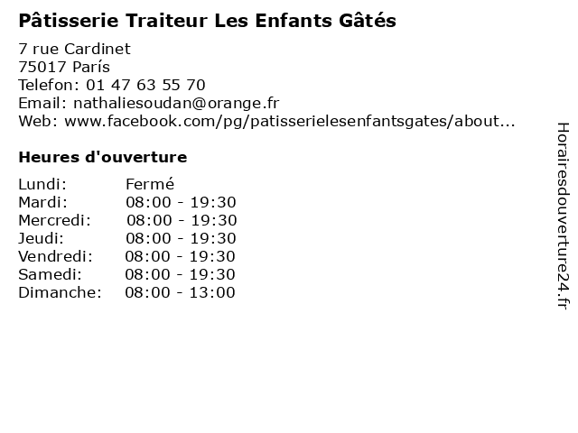 1 Pâtisserie Le Jardin Sucré (Distance: 0,07 km) 156 Rue de Courcelles, 75017 Paris boutique, créations, jardin, le, pâtisserie, sucré 2 4 Club Des Enfants Parisiens (Distance: 0,40 km) 57 Rue Ampère, 75017 Paris club, des, enfants, parisiens 5 La Pâtisserie des Rêves (Distance: 0,42 km) 19 Rue Poncelet, 75017 Paris artisan, chocolaterie, chocolatier, chocolats, des, desserts, la, patisserie, pâtisserie, pâtissier, rêves 6 La Pâtisserie - Cyril Lignac (Distance: 0,55 km) 9 Rue Bayen, 75017 Paris chocolat, cyril, la, lignac, macarons, pain, pâtisserie, viennoiseries |