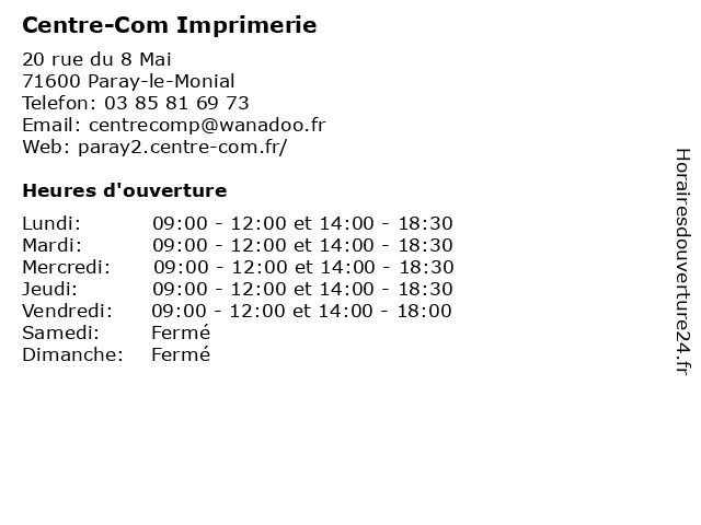 | Mardi | 09:00-12:00 et 14:00-18:30 |
