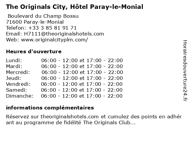 1 The Originals City (Distance: 0,01 km) Boulevard du Champ Bossu, 71600 Paray-le-Monial city, originals, the 2 B&B Hôtel - Réception (Du 11/07 au 15/08) (Distance: 0,15 km) - Zac du Champ Bossu, 71600 Paray-le-Monial 11/07, 15/08, accueil, au, b&b, du, hebergement, hotel, hôtel, personnalisé, réception 3 B&B Hôtel Paray-Le-Monial (Distance: 0,16 km) 22 Champ Bossu, 71600 Paray-le-Monial b&b, bar, hotel, hôtel, le, monial, paray, restaurant, service 4 Hôtel l'Hostellerie des 3 Pigeons (Inter-Hôtel) (Distance: 1,65 km) 2 Rue Dargaud, 71600 Paray-le-Monial accès, des, hebergement, hotel, hôtel, inter, l'hostellerie, pigeons 5 The Originals Boutique, Hostellerie des Trois Pigeons, Paray-le-Monial (Inter-Hotel) (Distance: 1,68 km) 2 Rue Dargaud, 71600 Paray-le-Monial boutique, des, hostellerie, hotel, hôtel, inter, le, monial, originals, paray, pigeons, restaurant, the, tourisme, trois 6 Hôtel Les Diligences (Distance: 10,92 km) 14 Rue Nationale, 71160 Digoin bar, diligences, hotel, hôtel, les, restaurant, service |