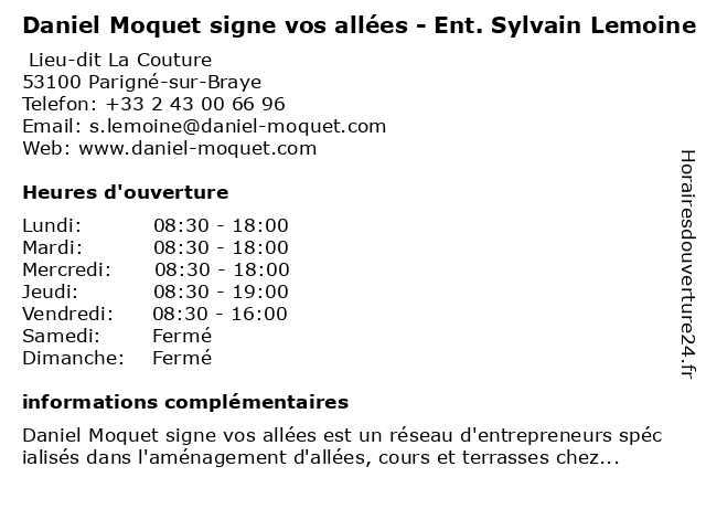 1 Daniel Moquet signe vos jardins - Ent. C.Martel (Distance: 0,29 km) Lieu-dit La Couture, 53100 Saint-Georges-Buttavent c.martel, création, crédit d'impôt, daniel, daniel moquet jardins, daniel moquet paysagiste, débroussaillage, désherbage, engazonnement, ent., entreprise entretien jardin, entretien, espaces verts, gazon de placage, jardinier, jardins, massif paysager, moquet, nettoyage, paysagiste, paysagiste jardin, signe, taille, taille de haies, tonte de pelouse, vos 2 Daniel Moquet signe vos clôtures - Ent. Poisson (Distance: 0,29 km) Lieu-dit La Couture, 53100 Parigné-sur-Braye carport, clôture, clôture aluminium, clôture bois, clôture composite, clôtures, daniel, daniel moquet clôtures, ent., grillage rigide, moquet, pergola, pergola bioclimatique, poisson, portail, portail aluminium, portail battant, portail coulissant, portail pvc, portillon, poseur de clôtures, poseur de menuiseries extérieures, poseur de pergola, poseur de portail, signe, store banne, vos 3 L'Epicerie de Fontaine Daniel (Distance: 1,58 km) 7 rue des Tisserands, 53100 Saint-Georges-Buttavent alimentation, boisson, daniel, de, fontaine, fruits, l'epicerie, légumes, épicerie 6 |