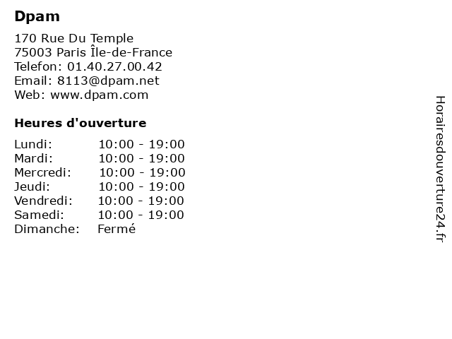 1 Dpam (Distance: 1,96 km) 23 Avenue Secretan, 75019 Paris Île-de-France affaires, boutique, dpam, produit, service, vêtements 2 Dpam (Distance: 2,18 km) 116/118 Rue De Belleville, 75020 Paris Île-de-France affaires, boutique, dpam, produit, service, vêtements 3 Dpam (Distance: 3,15 km) 1 Square Clignancourt, 75018 Paris Île-de-France affaires, boutique, dpam, produit, service, vêtements 4 Dpam (Distance: 3,96 km) 30 Avenue D'italie, 75013 Paris affaires, boutique, dpam, produit, service, vêtements 5 Dpam (Distance: 4,00 km) 11 Rue De Levis, 75017 Paris affaires, boutique, dpam, produit, service, vêtements 6 Dpam (Distance: 5,01 km) 115 Av Victor Hugo, 75016 Paris affaires, boutique, dpam, produit, service, vêtements |