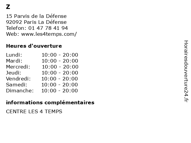 1 Z (Distance: 8,62 km) 112 Rue de Maubeuge, 75010 Paris cafe, chaussures, enfants, homme, lingerie, mode femme, restaurant, service 2 Z (Distance: 17,62 km) . Avenue du Luxembourg, 94531 Thais alimentation, beauté & santé, culture & loisirs, enfants, high-tech, maison & déco, mode, restaurants 3 Apple Store (Distance: 0,00 km) 15 Parvis de la Défense, 92092 Paris La Défense apple, chaussures, lingerie, mode enfant, mode femmes, mode hemmes, sport, store 4 Les Quatre Temps (Distance: 0,00 km) 15 Parvis de la Défense, 92092 Paris La Défense chaussures, les, lingerie, mode enfant, mode femmes, mode hemmes, quatre, sport, temps 5 Aubade (Distance: 0,00 km) 15 Parvis de la Défense, 92092 Paris La Défense aubade, chaussures, lingerie, mode enfant, mode femmes, mode hemmes, sport 6 Auchan Telecom (Distance: 0,00 km) 15 Parvis de la Défense, 92092 Paris La Défense auchan, chaussures, lingerie, mode enfant, mode femmes, mode hemmes, sport, telecom |
