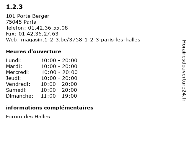 1 1.2.3 (Distance: 5,28 km) 4 Place de l'Europe, 94220 Charenton-le-Pont 1.2.3, accessoires, mode, vêtements 2 1.2.3 (Distance: 8,76 km) 15 parvis de la Défense, 92800 Puteaux 1.2.3, accessoires, mode, mode pour femmes, vêtements pour femmes 3 1.2.3 (Distance: 10,20 km) 12 rue de la Mare À Guillaume, 94120 Fontenay-sous-Bois 1.2.3, accessoires, mode, mode pour femmes, vêtements pour femmes 4 1.2.3 (Distance: 12,18 km) 101 Avenue du Général de Gaulle, 94012 Creteil 1.2.3, accessoires, mode, vêtements 5 1.2.3 (Distance: 14,96 km) 234 boulevard du Mont d'Est, 93160 Noisy-le-Grand 1.2.3, accessoires, mode, mode pour femmes, vêtements pour femmes 6 1.2.3 (Distance: 17,19 km) . Avenue Charles de Gaulle, 78158 Le Chesnay 1.2.3, beaute, cafe, chaussures, enfants, lingerie, mode femmes, mode hommes, restaurant, sport |
