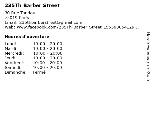 1 235TH Barber Street (Distance: 6,34 km) 2 Rue Armand Numès, 92600 Asnières-sur-Seine 235th, barber, street 2 235th Barber Street (Distance: 13,37 km) 13 avenue Vladimir ilitch Lénine, 92000 Nanterre 235th, barber, barbier, beauté, hommes, nanterre, salon, shop, street, style 3 235th Barberstreet (Distance: 2,67 km) 25 Boulevard du Temple, 75003 Paris 235th, barber shop, barberstreet, coiffure, la coupe de cheveux, salon de coiffure 4 L'Appartement 235th (Distance: 3,44 km) 15 Rue Étienne Marcel, 75001 Paris 235th, barbier, coiffeur, coupe, homme, l'appartement, rasage 5 Original Barber Shop (Distance: 3,48 km) 56 Rue du Temple, 75004 Paris 5original, barber, barbershop, coiffeur, coupes, original, shop 6 Barber Factory (Distance: 3,65 km) 16 Rue Jules Vallès, 75011 Paris barbe, barber, coiffure, factory, rasage, épilation |