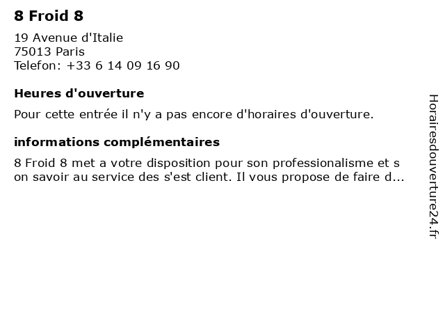 1 Franco Américaine Froid (Distance: 2,26 km) 101 Avenue du Général Leclerc, 75014 Paris américaine, franco, froid 2 Le Froid Pecomark (Distance: 2,86 km) 14 rue Jules Vanzuppe, 94200 Ivry sur Seine fournisseurs, froid, industriel, le, pecomark, équipements 4 Kali Froid (Distance: 3,54 km) 10 Avenue bel air, 75018 Paris climatisation, dépannage, entretien, froid, installation, kali, vente de pièces détachées 5 FMI - Froid Machines Industrielles (Distance: 3,87 km) 40 Rue Rottembourg, 75012 Paris climatisation, cuisine, dépannage, entretien, fmi, froid, industrielles, installation, machine à glace, machines, matériel frigorifique 6 National Froid Entreprise Climatisation (Distance: 5,86 km) 221 Rue la Fayette, 75010 Paris climatisation, entreprise, froid, national |