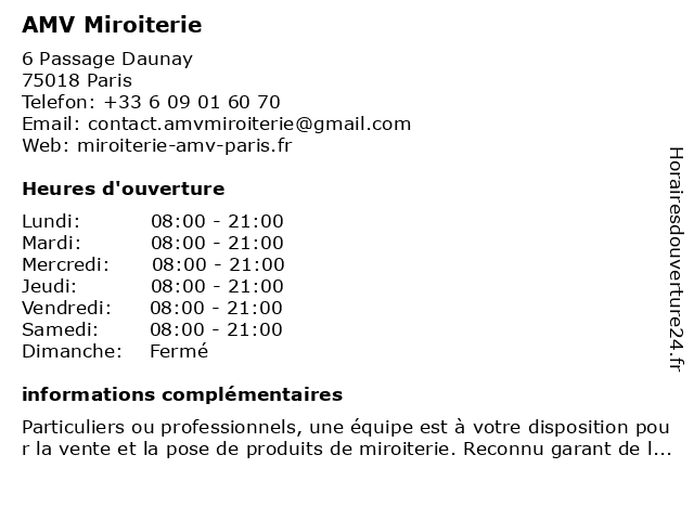 2 Miroiterie Vitrerie Boutel (Distance: 0,72 km) 40 Rue Damrémont, 75018 Paris boutel, miroiterie, salle de bain, sas, vitre sur mesure, vitrerie 3 Miroiterie des Mathurins (Distance: 1,49 km) 16 Rue Salneuve, 75017 Paris des, mathurins, menuiserie, miroiterie, produits verriers, vitrerie 4 Miroiterie Serrurerie Agencement M.S.A. (Distance: 1,62 km) 57 Rue d'Amsterdam, 75008 Paris agencement, m.s.a., miroiterie, serrurerie 5 Art Métal Miroiterie (Distance: 6,10 km) 164 Boulevard Mortier, 75020 Paris art, mesure, miroir, miroirs, miroiterie, métal, sur, verres, verres laqués 6 Miroiterie de Montfort (Distance: 6,98 km) 11 Rue Poussin, 75016 Paris de, découpe, façonnage, impression numérique sur verre, miroiterie, montfort, vitrerie |
