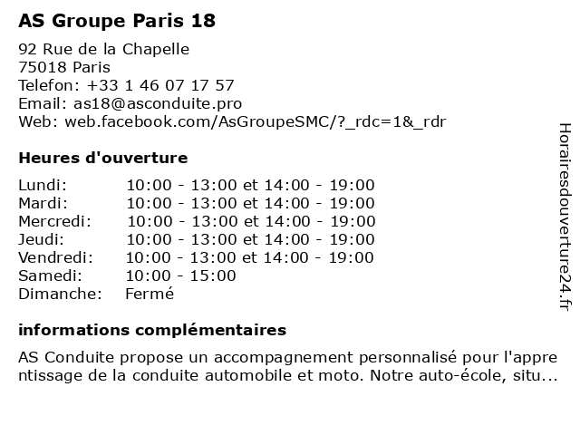 3 Centre Auto Point S - Speed As (Distance: 0,29 km) 56 Rue de la Chapelle, 75018 Paris as, auto, centre, controle, montage, pneu, point, révision, speed, vente 4 École de Conduite Nicolas (Distance: 1,11 km) 34 Rue Simart, 75018 Paris auto, conduite, de, formations, groupe, nicolas, école 5 6 AS Optical (Distance: 1,47 km) 133 avenue de Flandre, 75019 Paris as, lunettes, monture, optical, opticien, optique, solaire, vue |