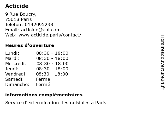 1 Paris Biocide (Distance: 0,74 km) 253 rue de Crimée, 75019 Paris biocide, dératisation, désinfection, exterminations, fumigations, paris, pestes 2 AC 2000 - Anti Cafard 2000 (Distance: 0,81 km) 51 Rue Ordener, 75018 Paris 2000, ac, anti, cafard, dératisation, désinfection, désinsectisation, intervention anti-punaises de lit 3 Anti Cafard 2000 (Distance: 0,81 km) 51 rue Ordener, 75018 Paris 2000, anti, cafard, dératisation, désinfection, désinsectisation, intervention, produits, vente 4 Hygiène Services Solutions (Distance: 1,20 km) 17 Allée des Eiders, 75019 Paris anti-pigeons, dératisation, désinfection, désinsectisation, hygiene, hygiène, services, solutions 5 Modart Nuisibles (Distance: 2,69 km) 174 Rue Legendre, 75017 Paris dératisation, désinfection, exterminations, fumigations, modart, nuisibles, pestes 6 Hygiène Premium (Distance: 2,76 km) 12 Bis av. de Clichy, 75018 Paris dératisation, désinfection, désinsectisation, hygiène, magasins, premium, services |