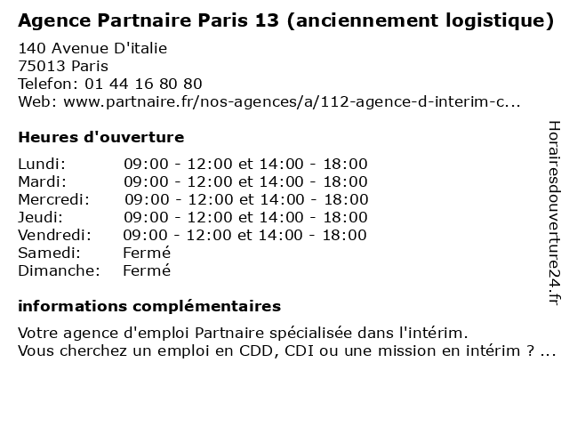 1 Partnaire Intérim (Distance: 0,01 km) 140 avenue d'Italie, 75013 Paris agence, interim, intérim, partnaire 2 Clinique Vétérinaire Mon Véto Paris 13 (Distance: 0,06 km) 93 Avenue d'Italie, 75013 Paris 13, clinique, mon, paris, véto, vétérinaire 3 StartWay Paris 13 Coworking et bureaux (Distance: 0,13 km) 83 Avenue d'Italie, 75013 Paris 13, bureaux, coworking, domiciliation, et, paris, paris 13, réunion, salles, startway 4 Clinique Vétérinaire Mon Véto Paris 13 (Distance: 0,15 km) 20b Rue Caillaux, 75013 Paris 13, clinique, mon, paris, véto, vétérinaire 5 Point Accueil 13 (ex MdEE du 13e) (Distance: 0,21 km) 14/18 rue Auguste Perret, 75013 Paris 13, 13e, accueil, du, equipement, ex, joyeuse, l'heure, livre, mdee, médiathèque, point, point accueil, services 6 Yespark, location de parking au mois - Métro Blanche - rue Philibert Lucot - Paris 13 (Distance: 0,31 km) 6 Rue Philibert Lucot, 75013 Paris 13, au, blanche, de, location, lucot, mois, métro, paris, parking, philibert, rue, yespark |