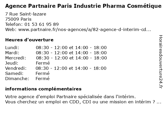 1 Partnaire Interim (Distance: 0,47 km) 7 rue Saint Lazare, 75009 Paris agence, cdd, emploi, interim, partiel, partnaire 2 Partnaire Intérim (Distance: 0,85 km) 5 rue du 4 Septembre, 75002 Paris agence, interim, intérim, partnaire 3 CRIT PARIS Industrie Aéronautique (Distance: 1,09 km) 27 Rue de Rome, 75008 Paris aéronautique, crit, industrie, paris 4 CRIT PARIS Industrie Tertiaire (Distance: 1,10 km) 27 Rue de Rome, 75008 Paris crit, industrie, paris, tertiaire 5 Partnaire Interim (Distance: 1,22 km) 131 Rue la Fayette, 75010 Paris agence, cdd, emploi, interim, partiel, partnaire 6 Partnaire Intérim (Distance: 1,25 km) 15 rue Saint-Quentin, 75010 Paris agence, interim, intérim, partnaire |