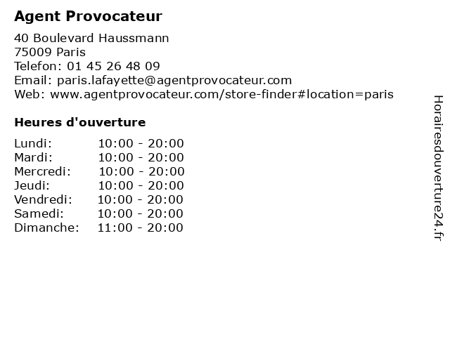 1 Agent Provocateur (Distance: 0,30 km) 64 Boulevard Haussmann, 75009 Paris agent, bridal accessories, lingerie, provocateur, swim wear, underwear 2 Agent Provocateur (Distance: 0,85 km) 12 Rue Cambon, 75001 Paris agent, bridal accessoires, lingerie, provocateur 3 Agent Provocateur (Distance: 2,21 km) 38 Rue de Grenelle, 75007 Paris agent, bridal accessories, lingerie, provocateur, swim wear, underwear 4 WST Agent (Distance: 2,43 km) 85 boulevard de Courcelles, 75008 Paris agent, distance, enseignement, formation, sport, sportif, wst 5 AD Paris Felix Canis Agent (Distance: 3,15 km) 20 Rue de Longchamp, 75116 Paris ad, agent, canis, felix, paris 6 Je suis Agent Immobilier (Distance: 4,50 km) 26 Rue des Rigoles, 75020 Paris agence, agent, appartement, immeuble, immobilier, immobilière, je, locations, maison, suis, vente |