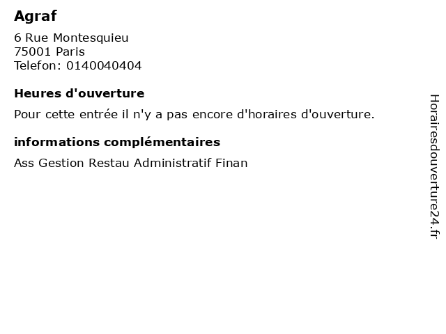 1 Agraf (Distance: 3,59 km) 35 Rue Du Plateau, 75019 Paris administratif, agraf, ass, finan, gestion, restau, restaurants 2 Agraf (Distance: 4,36 km) 12 Rue Charles Fourier, 75013 Paris administrative, agraf, association, fourier, gestion, immeuble, restaurants, restauration 3 Agraf (Distance: 14,80 km) Hotel Des Impots Fonciers, 91100 Corbeil Essonnes administratif, agraf, ass, finances, gest, restau, restaurants 4 AGRAF Restaurant (Distance: 0,43 km) 9 rue de la Banque, 75002 Paris a.g.r.a.f, agraf, café, cafétéria, déjeuner, entreprise, menus, restaurant, restauration 5 AGRAF Restaurant (Distance: 6,18 km) 10 rue Auguste Blanqui, 93100 Montreuil a.g.r.a.f, agraf, café, cafétéria, déjeuner, entreprise, menus, restaurant, restauration 6 AGRAF Restaurant (Distance: 12,81 km) 9 avenue des Arts, 94100 Saint-Maur a.g.r.a.f, agraf, café, cafétéria, déjeuner, entreprise, menus, restaurant, restauration |