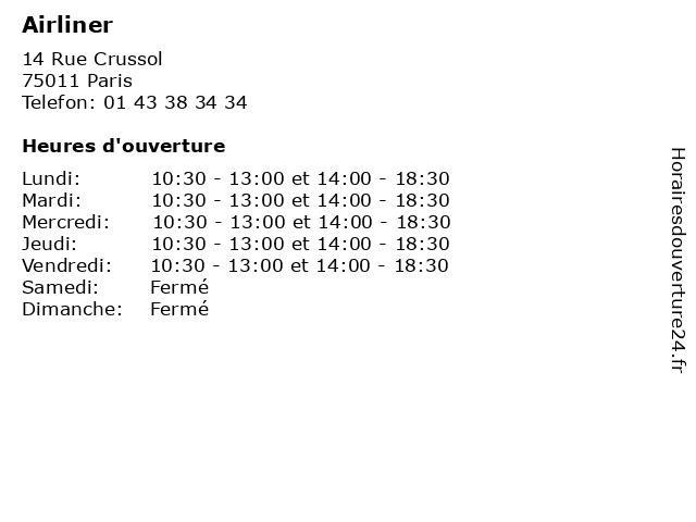 | Lundi | 10:30-13:00 et 14:00-18:30 |