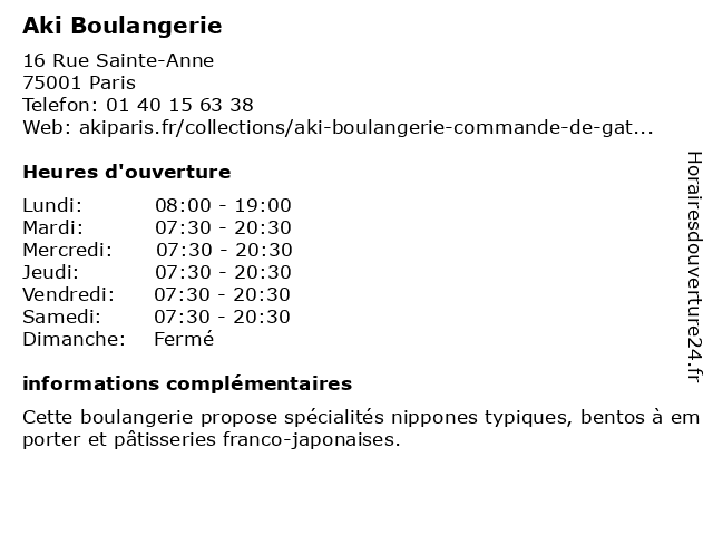 2 Aki Restaurant (Distance: 0,03 km) 11 bis Rue Sainte-Anne, 75001 Paris aki, japonais, nouilles, pâtes, restaurant, traditionnel 4 Aki Boulanger (Distance: 2,20 km) 9 rue du Faubourg du Temple, 75010 Paris aki, boulanger, boulangerie, pains, pause déjeuner, pâtisserie, traiteur 6 Boulangerie Paul (Distance: 2,37 km) 112 Rue de Maubeuge, 75010 Paris boulangerie, cafe, chaussures, enfants, homme, lingerie, mode femme, paul, restaurant, service |