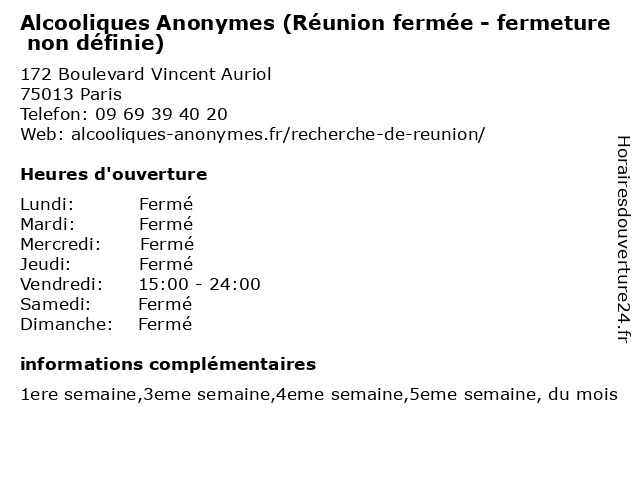 1 Alcooliques Anonymes (Réunion fermée - fermeture non définie) (Distance: 0,65 km) 65 Rue Corvisart, 75013 Paris alcooliques, anonymes, définie, fermeture, fermée, non, réunion 2 Alcooliques Anonymes (Réunion fermée - fermeture non définie) (Distance: 1,22 km) 115 Rue de la Santé, 75013 Paris alcooliques, anonymes, définie, fermeture, fermée, non, réunion 3 Alcooliques Anonymes (Réunion fermée - fermeture non définie) (Distance: 1,67 km) 9 Villa Saint-Jacques, 75014 Paris alcooliques, anonymes, définie, fermeture, fermée, non, réunion 4 Alcooliques Anonymes (Réunion fermée - fermeture non définie) (Distance: 2,10 km) 13 Rue des Bernardins, 75005 Paris alcooliques, anonymes, définie, fermeture, fermée, non, réunion 5 Alcooliques Anonymes (Réunion fermée - fermeture non définie) (Distance: 2,55 km) 1 Parvis Notre-Dame, 75004 Paris alcooliques, anonymes, définie, fermeture, fermée, non, réunion 6 Alcooliques Anonymes (Réunion fermée - fermeture non définie) (Distance: 2,82 km) 7 Rue du Pasteur Wagner, 75011 Paris alcooliques, anonymes, définie, fermeture, fermée, non, réunion |